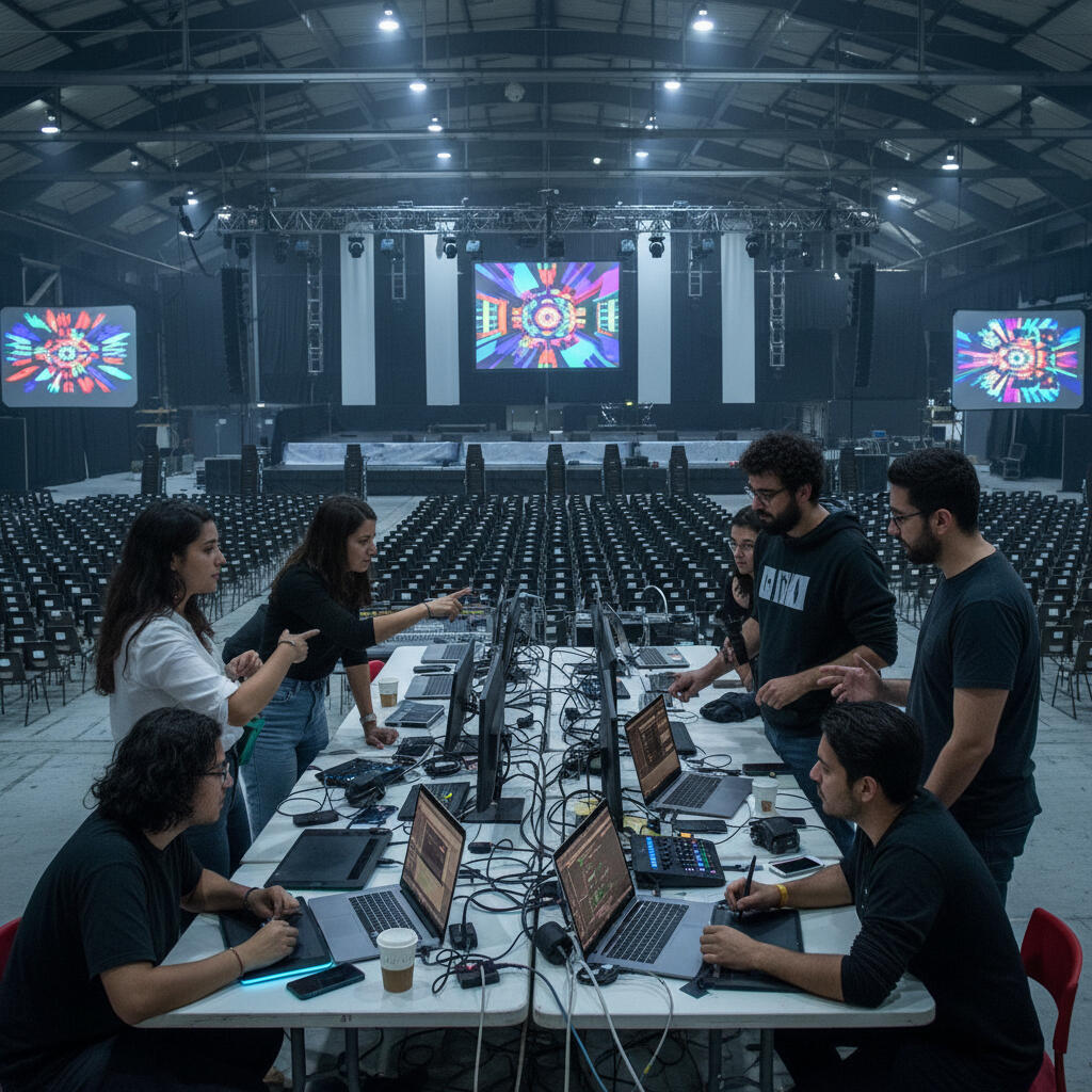 Se realiza la calibración milimétrica para que la proyección se adapte con precisión a la superficie.Todo queda listo para que el show comience.