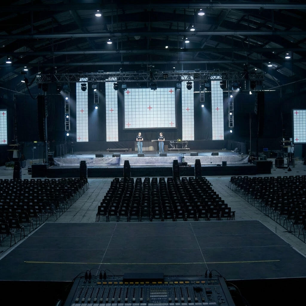 Se realiza la calibración milimétrica para que la proyección se adapte con precisión a la superficie.Todo queda listo para que el show comience.